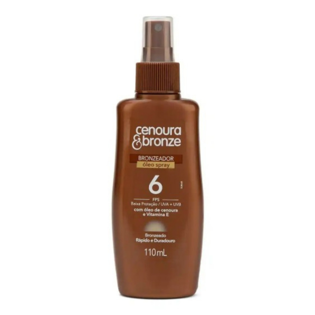 Cenoura & Bronze FPS 6 Bronzeador Duradouro Óleo Spray 110ml. Óleo bronzeador corporal indicado para quem busca realçar o bronzeado durante a exposição ao sol, com proteção leve. Ideal para uso em momentos de lazer ao ar livre, ajudando a intensificar o tom da pele de forma gradual. Por se tratar de FPS baixo, é indicado para peles já adaptadas ao sol e exige reaplicação frequente. Sugestão de uso: aplicar de maneira uniforme sobre a pele antes da exposição solar e reaplicar ao longo do dia, especialmente após contato com água, suor excessivo ou ao se secar com toalha.